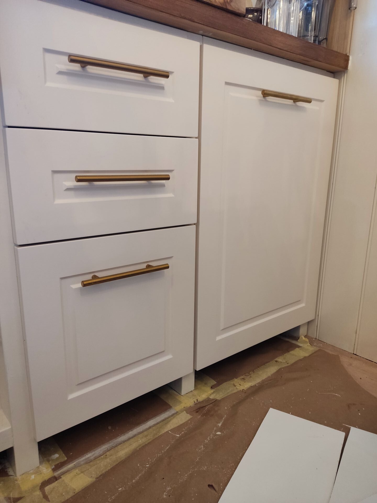 Het vervangen van de deurtjes was meer werk dan ik op voorhand had verwacht. Dat kwam door het voorboren van gaten en gaatjes, handgrepen plaatsen, een toch-jammer-maar -helaas-onjuist deurtje aanpassen, stellen van de deurtjes, enz.