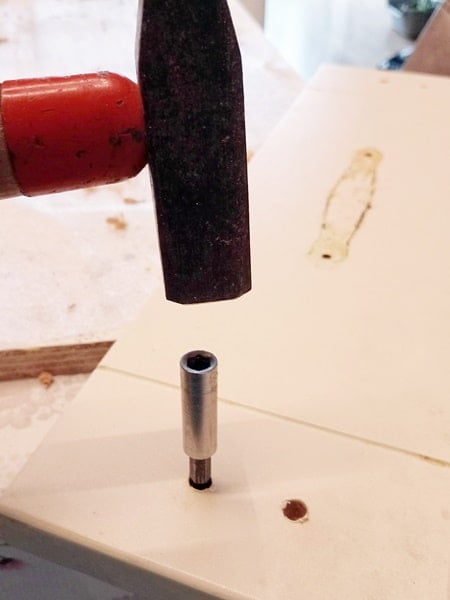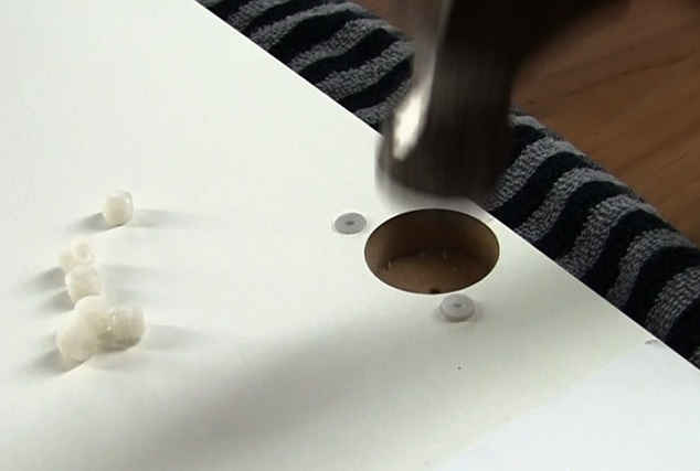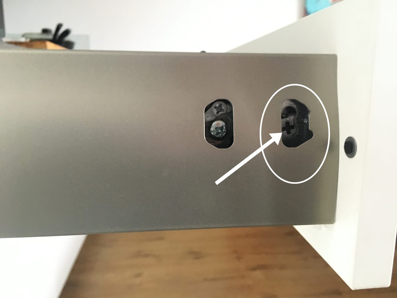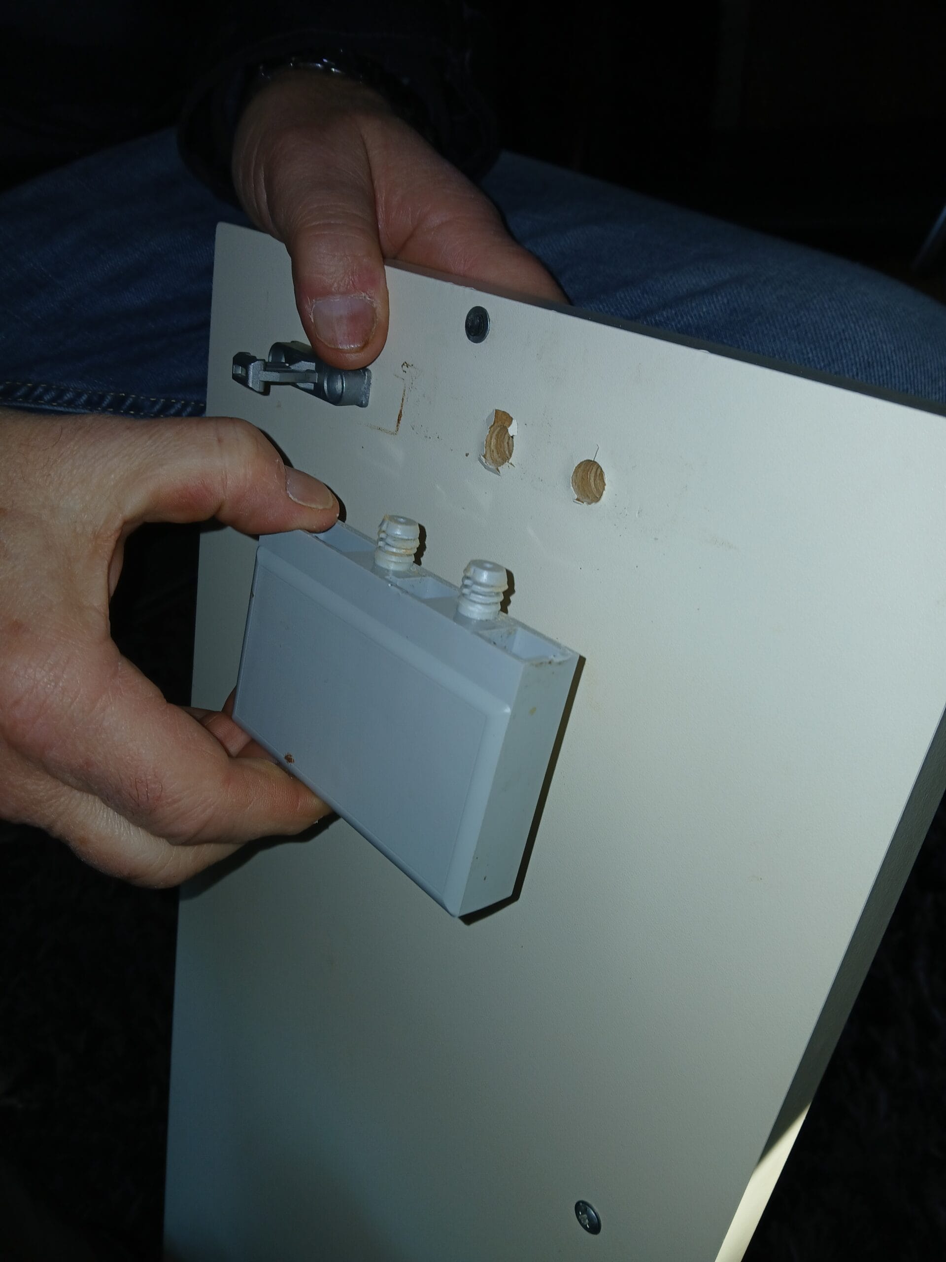 Het bovenste schroefgat vul je op met een wit plastic dopje zoals ze bij het Zweedse Designers huis Ikea ook gebruiken om gaatjes weg te werken.