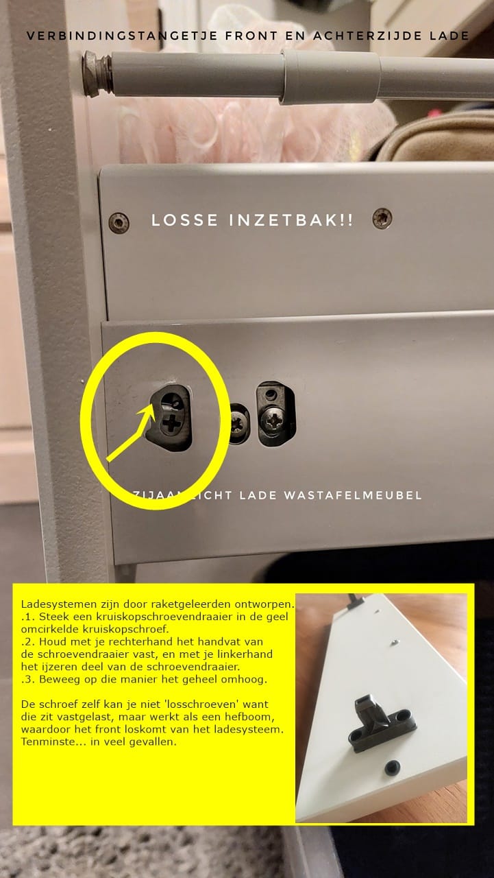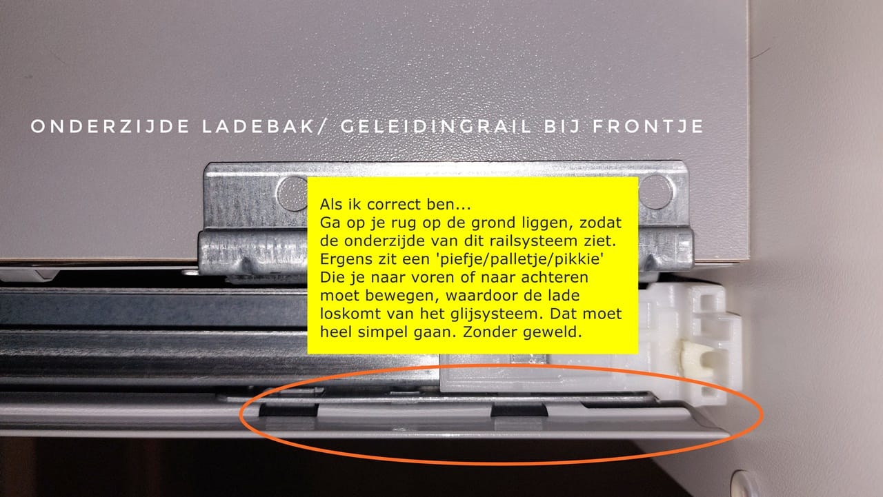 Helaas zijn “pielen” en “uitvogelen” twee woorden die horen bij het de- monteren van een ladefront van het ladesysteem.