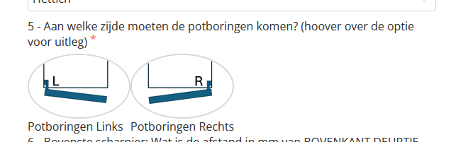 Op de productpagina van het keukendeurtje van jouw keuze, vragen we of je potboringen wilt. Als je bij die stap het aantal potboringen dat je wilt, selecteert, dan krijg je (automatisch) de volgende vraag te zien, namelijk: waar moeten die potboringen komen: Potboringen rechts, de deur opent vanaf de linkerzijde. Of: Potboringen links, de deur opent vanaf de rechterzijde.